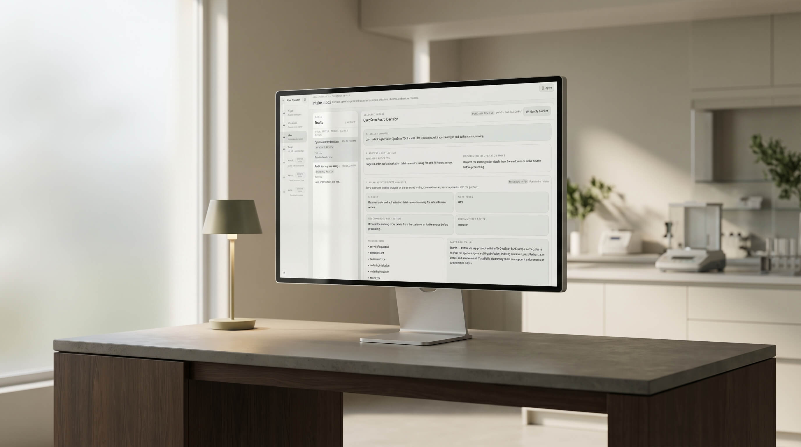 The operator-facing surface for diagnostic operations — live visibility, structured intake, and physical-to-digital sample capture in one layer.